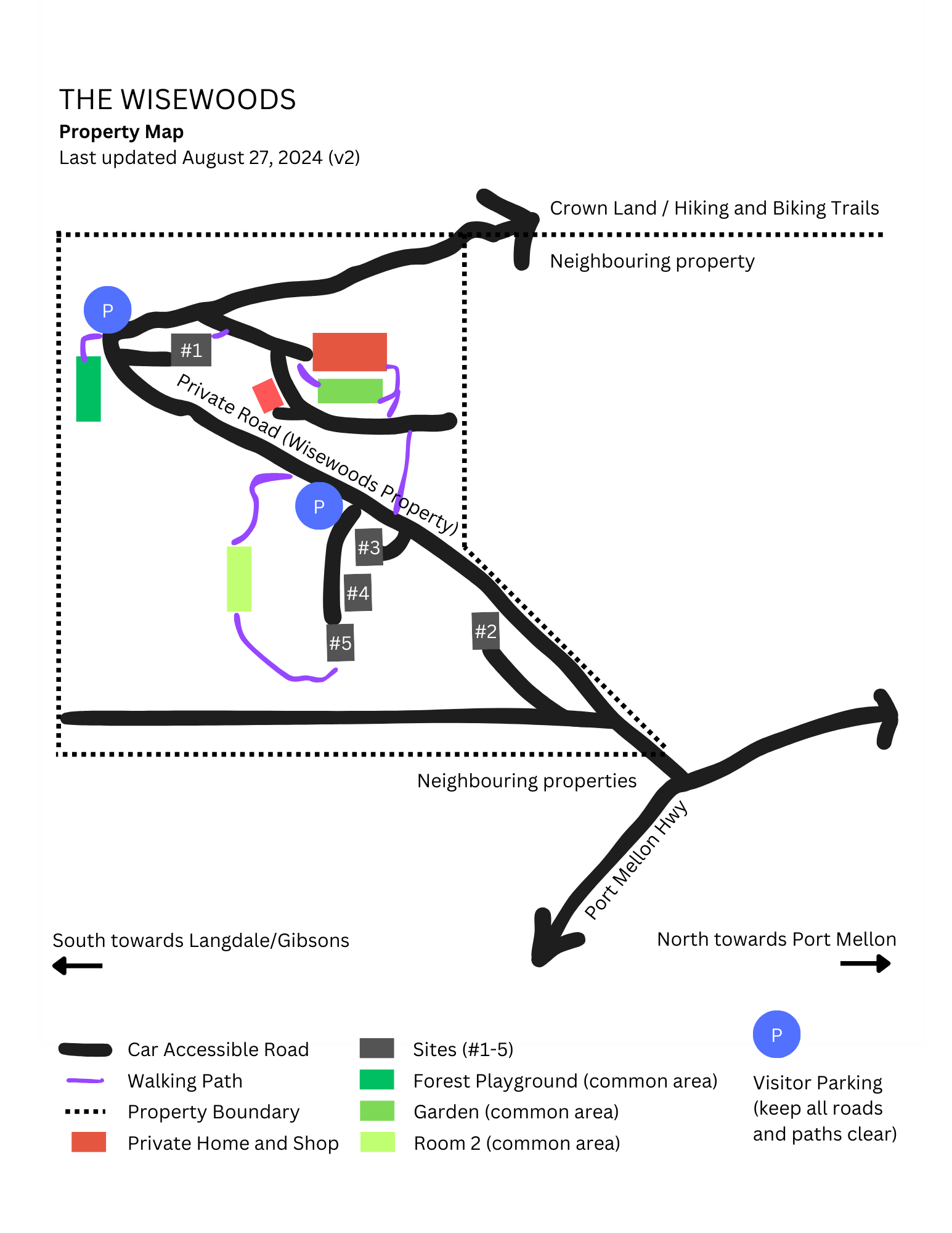 Wisewoods encompasses over 11 acres of private property that is mostly forested. It includes private and shared sites, environmentally sensitive and protected areas, and it has neighbouring privately owned properties. For your enjoyment and safety, and with respect to our neighbours, please familiarize yourself with the property map (current version below) and pay attention to any signage posted around the property.
